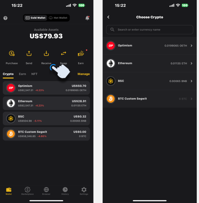 2. Tap the "Receive" at the top of the wallet page and select the cryptocurrency you want to receive.